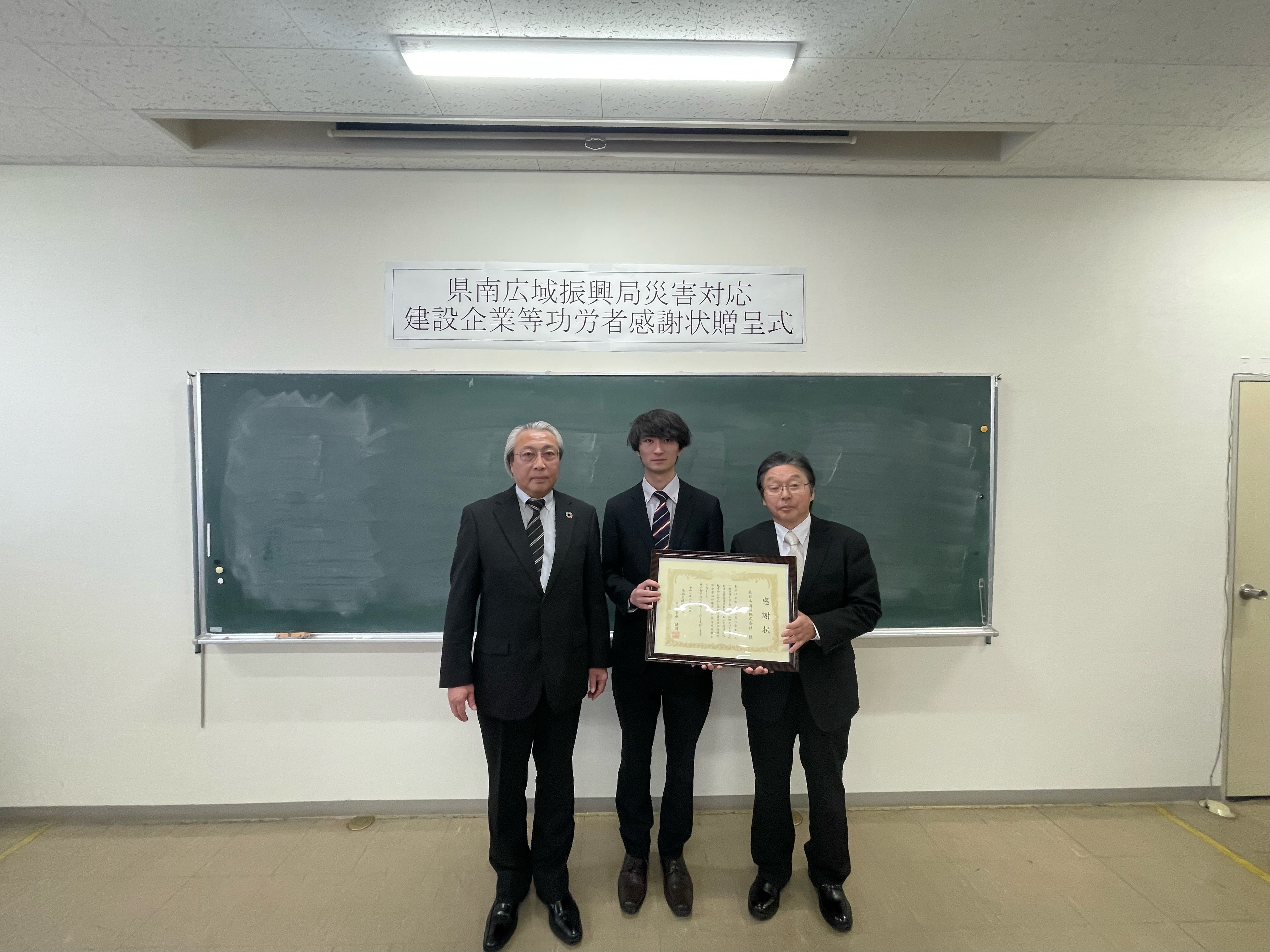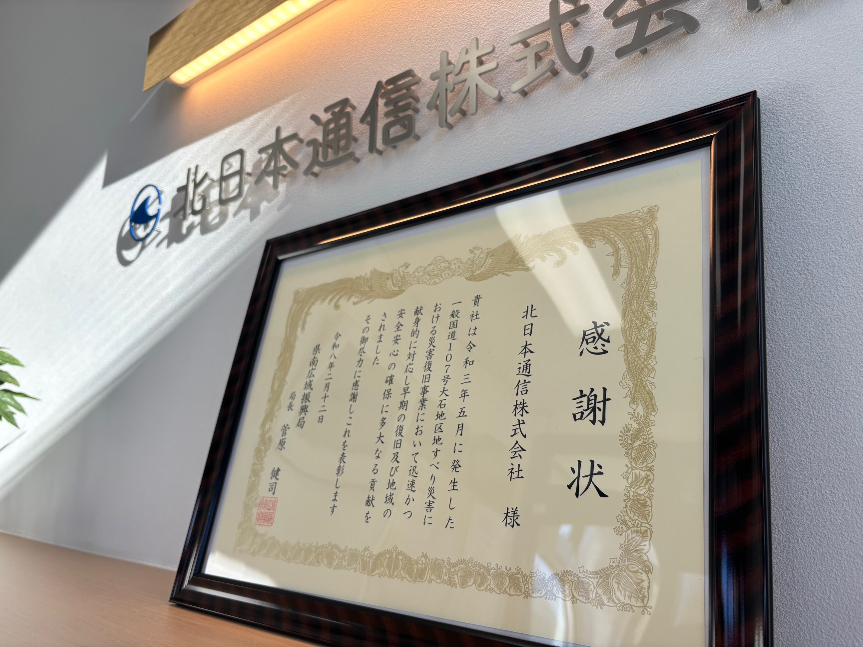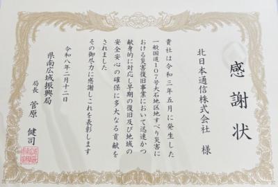 今回の表彰は、本復旧工事において迅速に工事を進め、早期の交通確保と地域の生活基盤の安定に寄与した12社が対象となったもので、北日本通信もその1社として選ばれました。